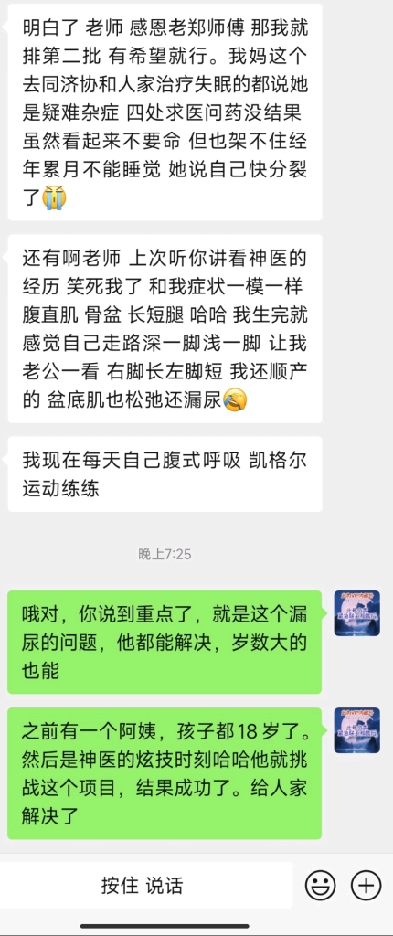 - 产后的骨盆打开盆底肌松弛导致的漏尿问题,越到晚年其实会越严重的。岁数大了以后肌肉无力,这个问题会越发的明显。老年人有的时候身上有一些味道,其实跟这个漏尿有关系。这个问题是神医那边确定一定能解决的。但凡是骨啊肉啊,这些物理性质的出的问题是解决起来很容易的。