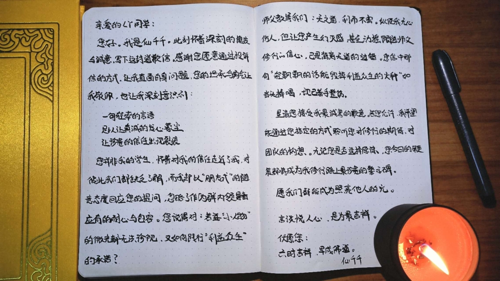您并非我的学生,怀着对我的信任走近了我,对彼此我们都缺乏了解,而我却以“朋友式”的随意态度回应您的提问,忽略了作为群内领导者应有的耐心与包容。 您说得对:若连”小人物“的微光都无法珍视,又如何践行利益众生的承诺? 师父教导我们:天之道,利而不害。纵使我无心伤人,但让您产生幻灭感,甚至动摇跟随师父修行的信心,已是背离天道的过错。您信中那句“轻飘飘的话能毁掉利益众生的火种”如当头棒喝,现已着手整饬。