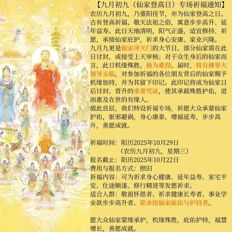 九月九更是仙家冲天门的大节日。部分仙家需在此日讨封,或接受上天审核;对于众生身后的仙家而言,此日机缘殊胜,极为难得。届时,将有佛界大领导亲临,对参加祈福的各位朋友背后的仙家赐予机缘加持,并为其留下印记。此印记将成为仙家日后讨封、晋升的重要凭证,使其承载殊胜护佑,进而惠及在世的有缘人。