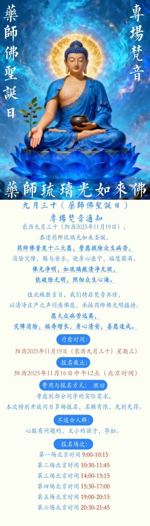 值此殊胜吉日,我们特启梵音共修,以清净庄严之声同感佛愿,承接药师佛光明摄持。愿大众病苦远离,灾障消除,福寿增长,身心清安,善愿速成。