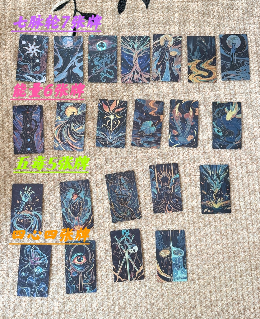 对应的是七脉轮的七张牌 然后那个能量蜡烛的六张牌重生 菩提 大爱 脉轮 平衡 能量 还有就是五毒四星的九张牌 一共就这些 我觉得真的是太完美了 多一句废话都没有